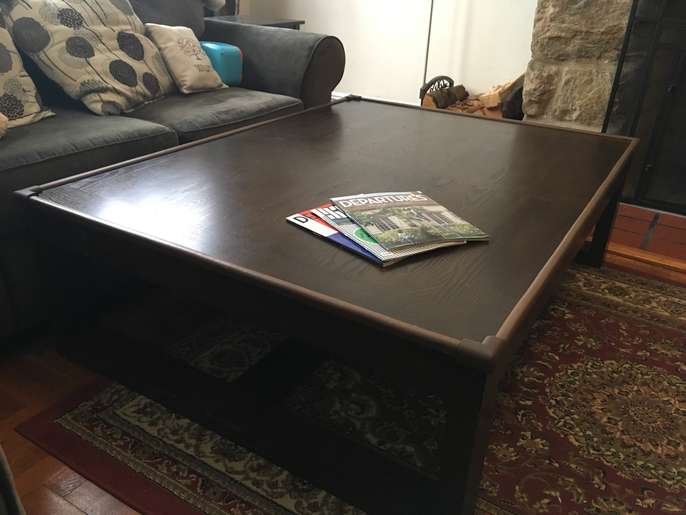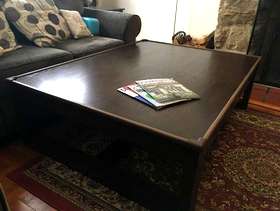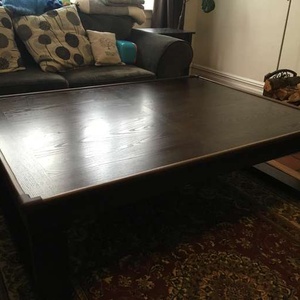 Dark brown coffee table 42”x56” comes with baby proofed edges and corners. (Padded material comes off, but you may need some goo gone if you really want it clean afterwards)