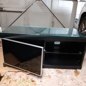 Heavy solid black wood tv cabinet with optional glass top. Very heavy. Approx 376 inches wide, 16 inches tall and 17 inches deep. Will need 2 people to lift for transport.