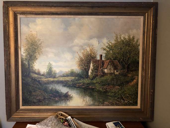 Painting measures 49” X 39” Please check that it will fit in your vehicle. It’s does have one small tear in the canvas, see pictures. Painting is signed Fiora Cozzi. https://www.qart.com/fiora-cozzi-biographies/4102 The first person who can come get it gets it.