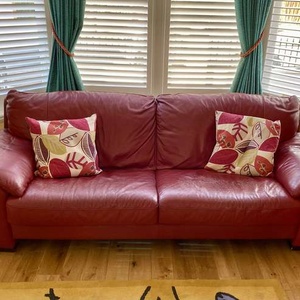Large leather sofa - 3 seater measuring 2m 30cm wide 77cm high and 97cm deep Burgundy/deep red colour Complete with 2 scatter cushions For collection only