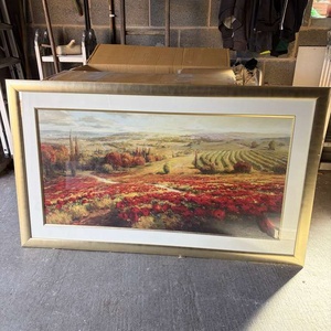 Mounted picture in gold frame. Mainly red and green