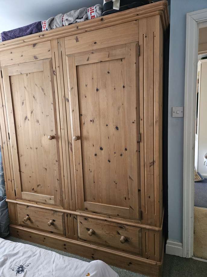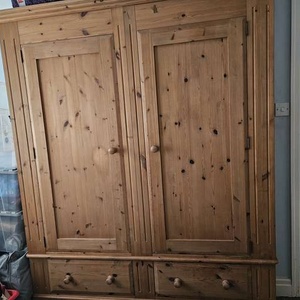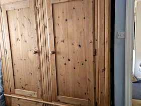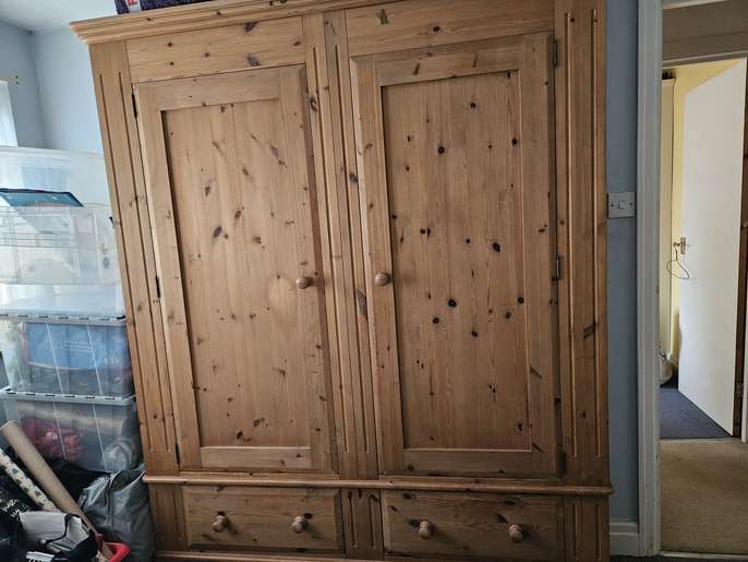 Large pine wardrobe in good condition. Upstairs so needs taking downstairs by collector