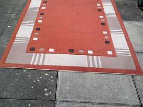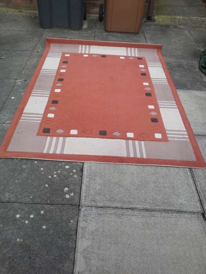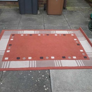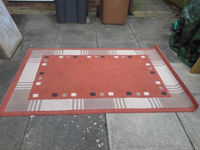 Large rug. Mainly terracotta in colour, rectangular. 120 x 170 cm. Few marks will probably come out if cleaned.