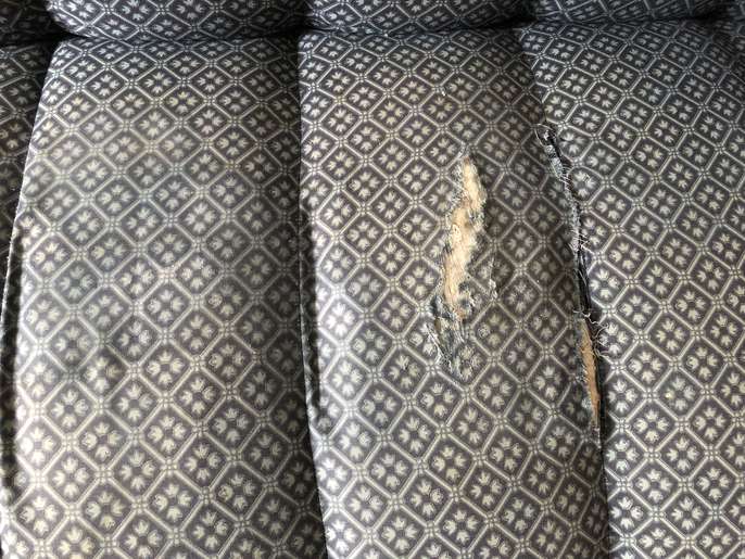Large sofa approx 88 in long ( over 7ft) Long and deep enough to be used as a bed ! There are some rips on seat part and think bit cat scratches on bit of side. Otherwise in good condition and very sturdy. So not perfect but with a throw would work Have a look at pics Feet unscrew