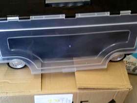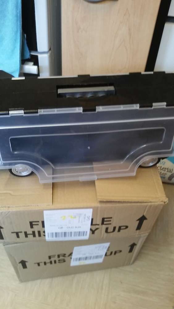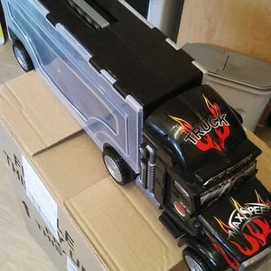 Large toy truck that has compartments either side (which lift up) to store smaller toy cars.