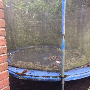 Trampoline has been outside so looks a bit old but plenty of bounce left in it. Full net around it and cushion padding around edges. 10foot across together. 104 cms across black part. Buyer must collect and dismantle.