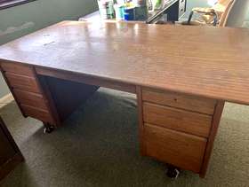 Large 1970s wooden office desk with 2 deep draws and 4 smaller draws. See photos Would be great for someone who loves crafting or a great up cycling project! Will need 2 people to move downstairs