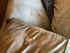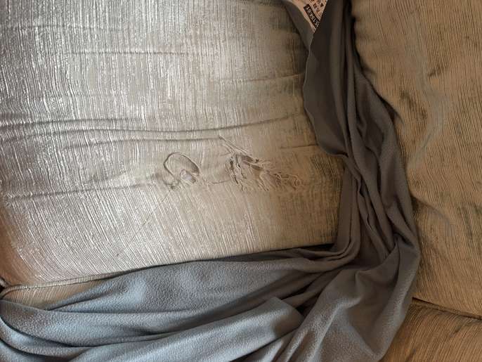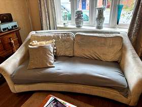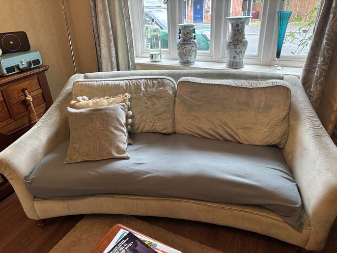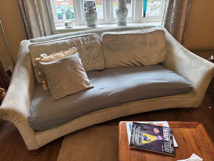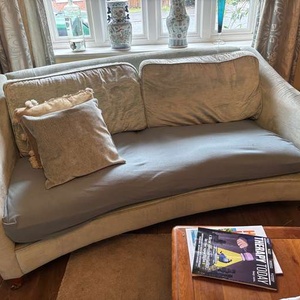 Pale duck egg Laura Ashley sofa. Very comfy. Unfortunately there is a tear in each seat cushion which could be covered by a sofa cover or a clever upholsterer. Covers are machine washable. I need gone by 6th Feb. Measurements 2m wide, 0.9m deep. Collection from Haslemere.