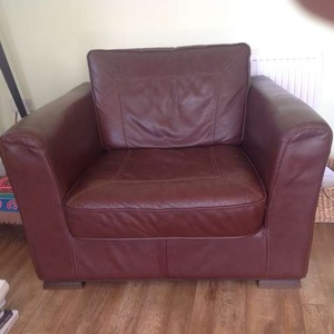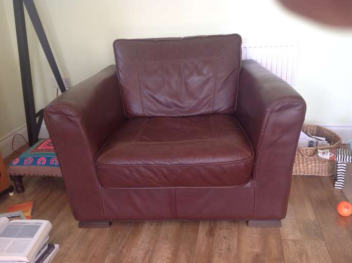 Brown leather armchair originally from DFS. Very comfortable. Removable cushions. Unfortunately the end of one of the arms has a few scratches as in photo. Free to a good home