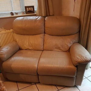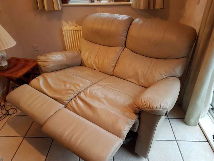 Two seater manual recliner. Worn but comfortable. Sofa splits in two for easy transportation but I am unable to lift so will require two people for pick up.