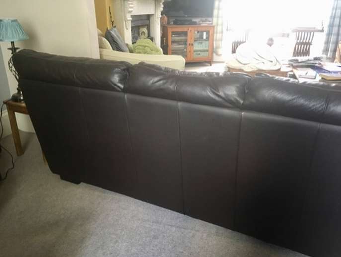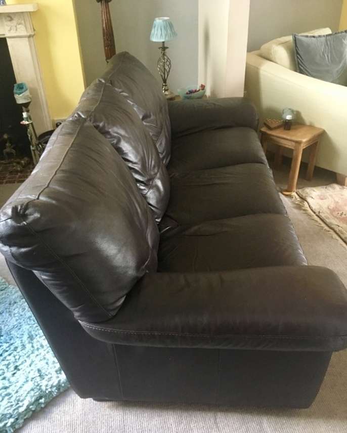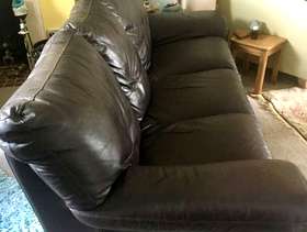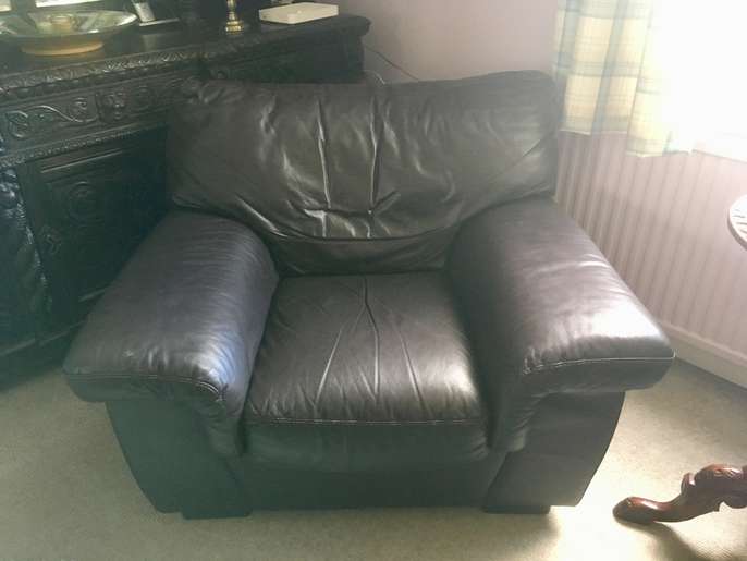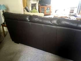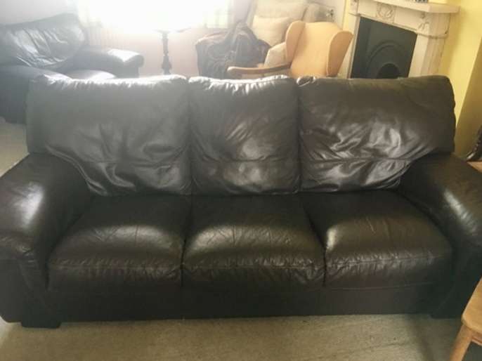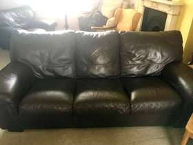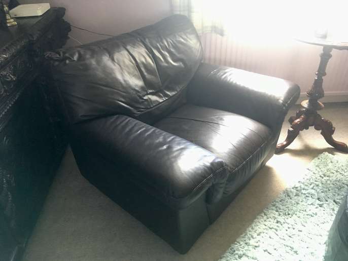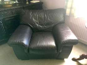 • 3 seater dark real leather sofa and leather arm chair • very good condition • width 7ft depth 3ft height 3ft (sofa) • free to the person able to pick it up first!