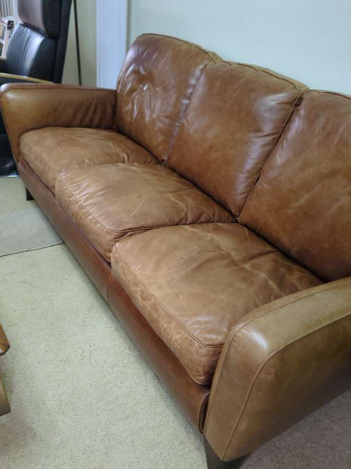 Three seater Italian leather sofa by Contempo. The leather is of the best quality, but has faded in some areas. Seat cushions could do with replacement pads but have zips to allow this. Please note although the sofa is about ten years old l cannot see any fire labels on the sofa. Item in Sundon Park.Please call for any further details 07968 288410.