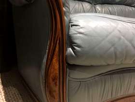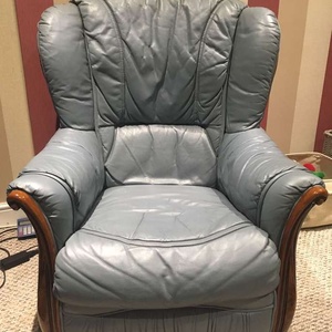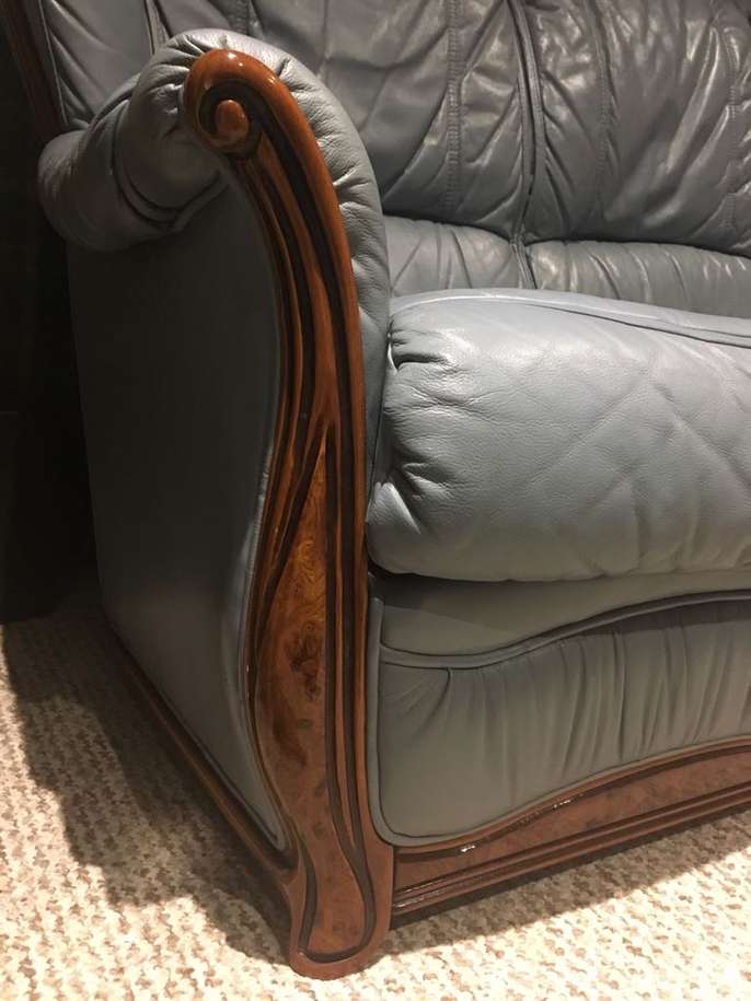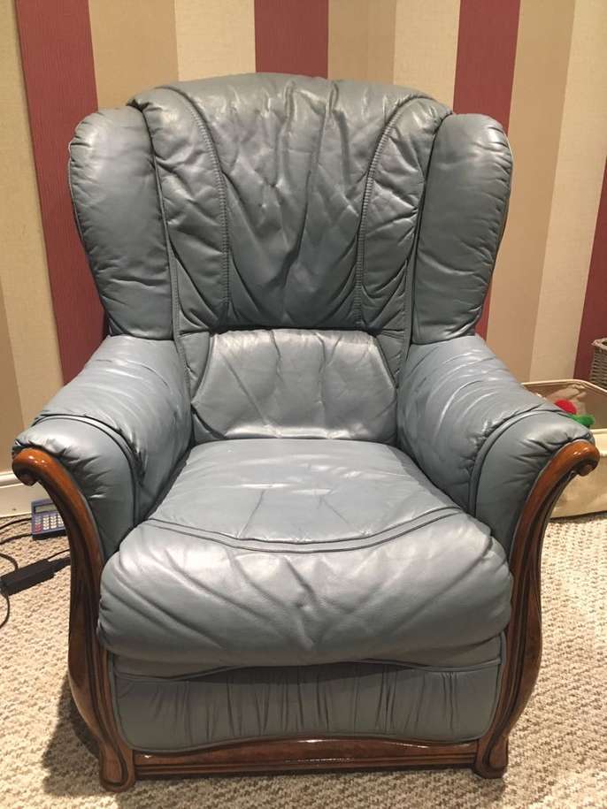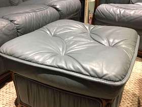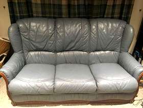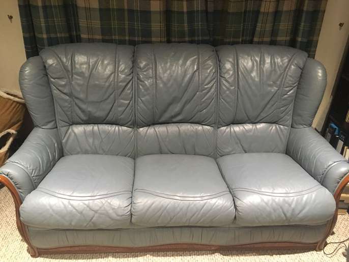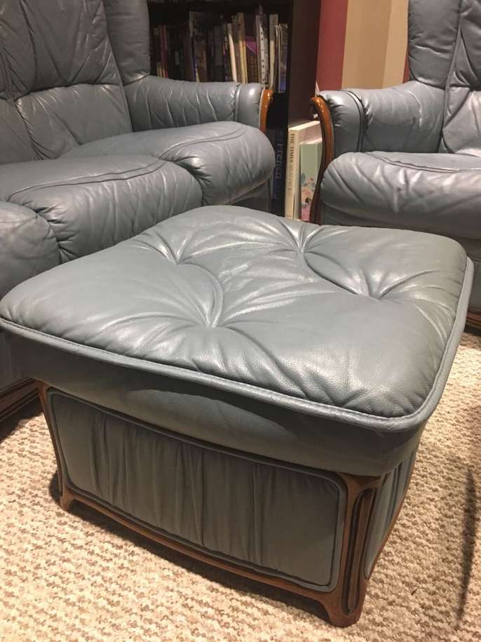 Teal coloured 4 piece set comprising sofa, 2 armchairs and footstool. Sofa is longer than average and sits 4 people. You would need a transit van to collect. I am sorry we are unable to deliver. Needs to be gone by November 17.