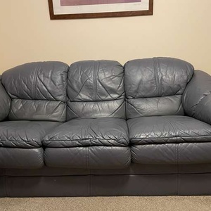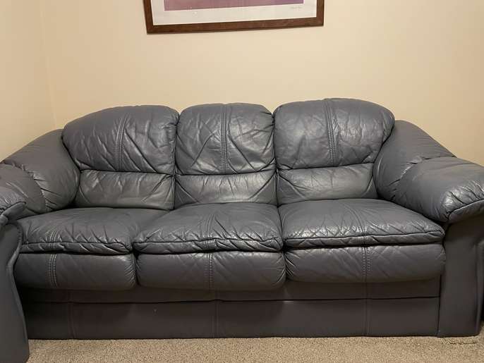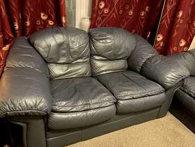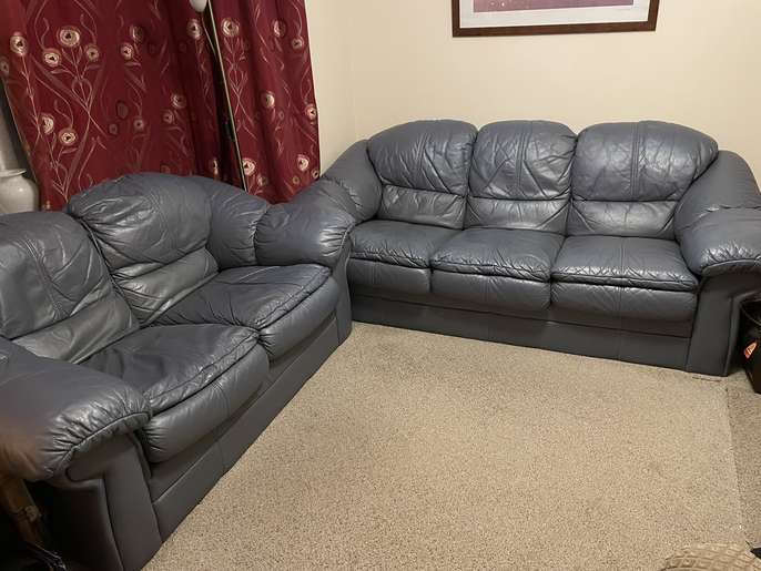 2 sofas. Leather. Air force grey/blue 3 seater approx 210 x 90 2 seater approx 160 x 90 Heavy to move. Please arrange own transport. Available immediately.