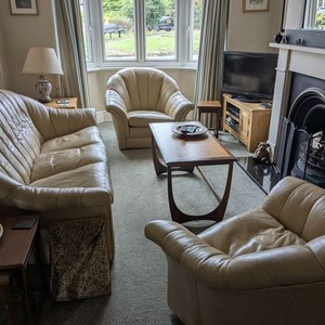 Free leather suite. 1 cushion cover is a little worn and a caster is missing on one of the chairs. For collection only from Alvechurch.