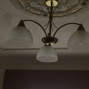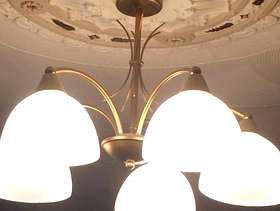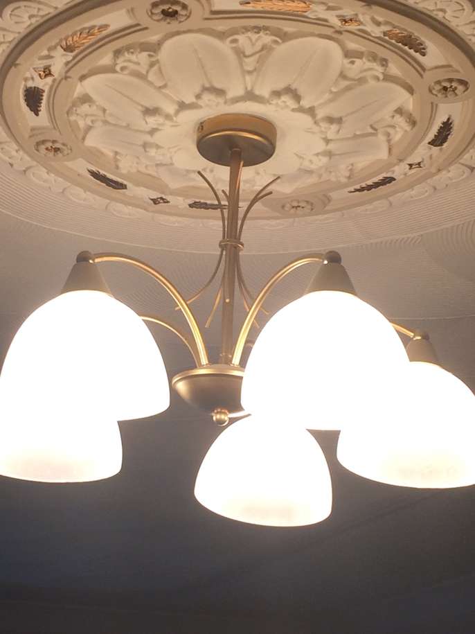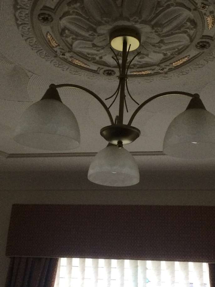 A set of matching lights: 5 bulb and 3 bulb ceiling light fittings and a two bulb matching wall fitting. Perfect condition. Unfortunately the electrician had removed the wall light before I photographed it.