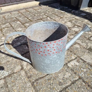 Lightweight galvanised plant holder in the design of a watering can with red star pattern. Useful for outdoor or indoor plant display.