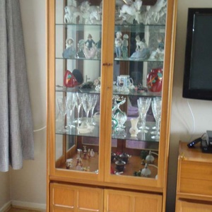 Wood and glass display cabinet very good condition. Four glass shelves and a cupboard at the bottom. Buyer collects - contents not included
