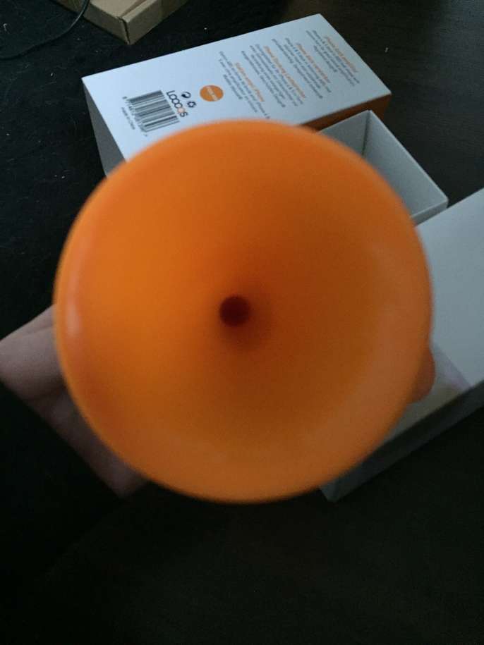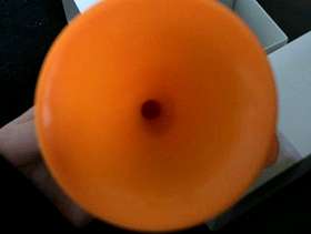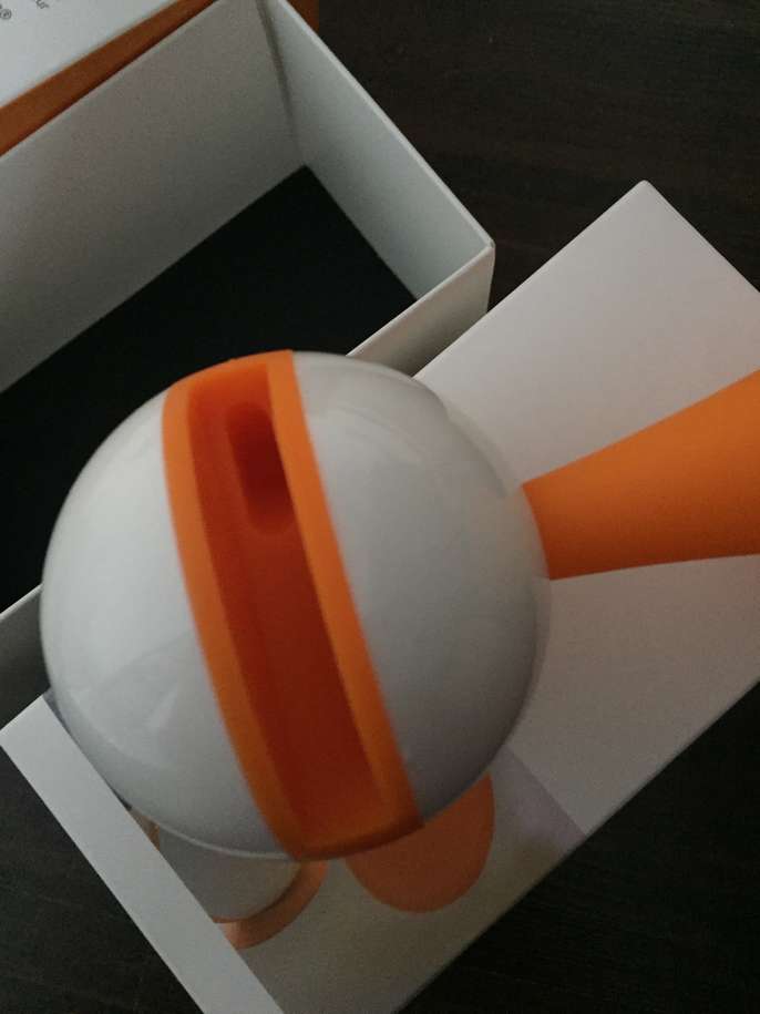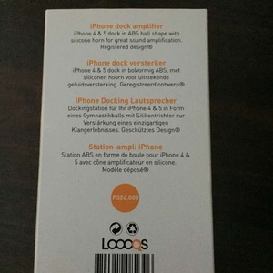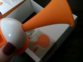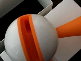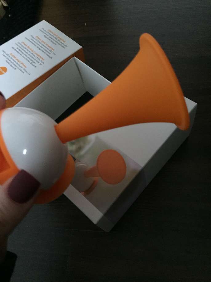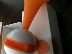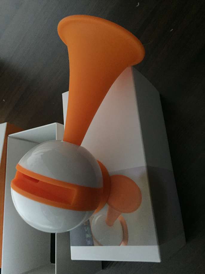 Orange and white plastic speaker, suitable for iPhone 4 and 5, no longer have this phone make. Produces good sound, and very reliable.
