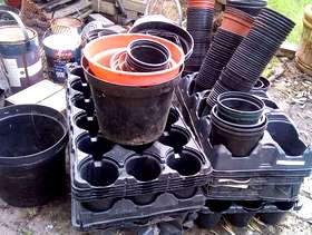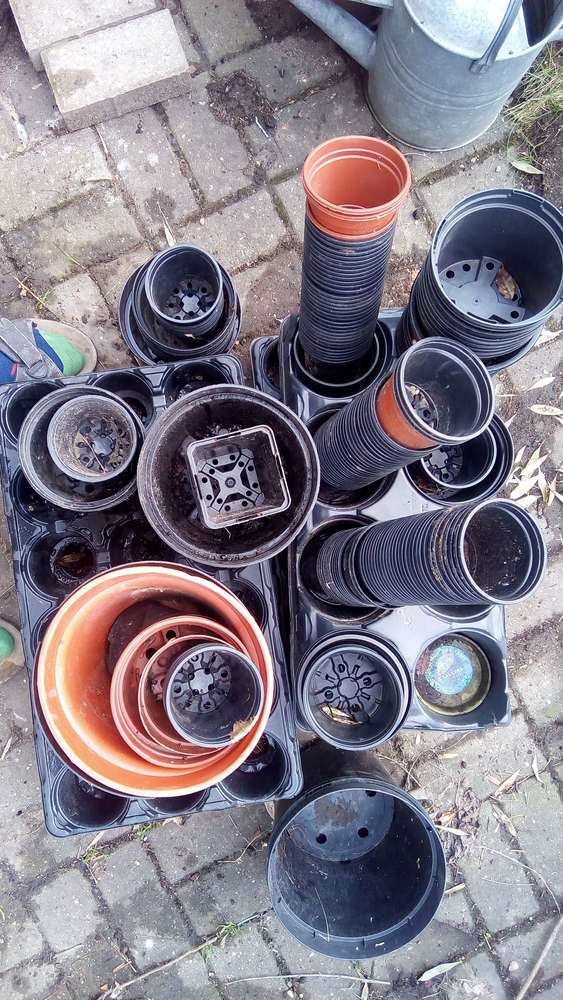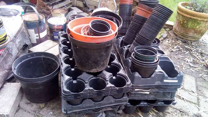 Dozens of plastic plant pots and carriers. Mostly small but a few large ones. See photos. I'll give them a rinse but it would be a good idea to sterilise them or at least clean them properly before using.