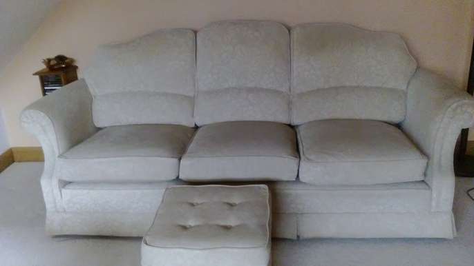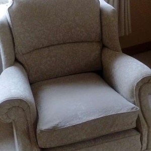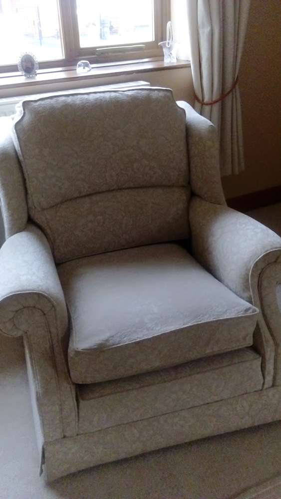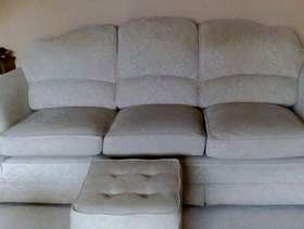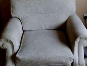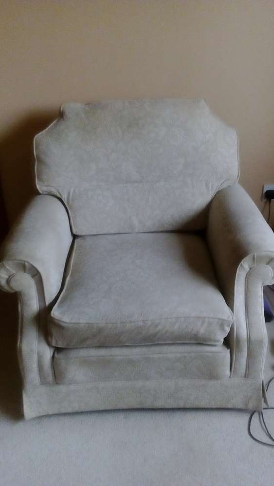 Beige and cream lounge suite consisting of 3 seater settee and two armchairs and a footstool. Needs to go by 8th November when new one is being delivered. Free to collector.