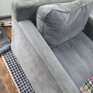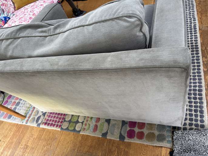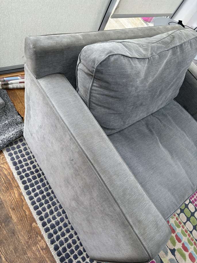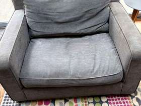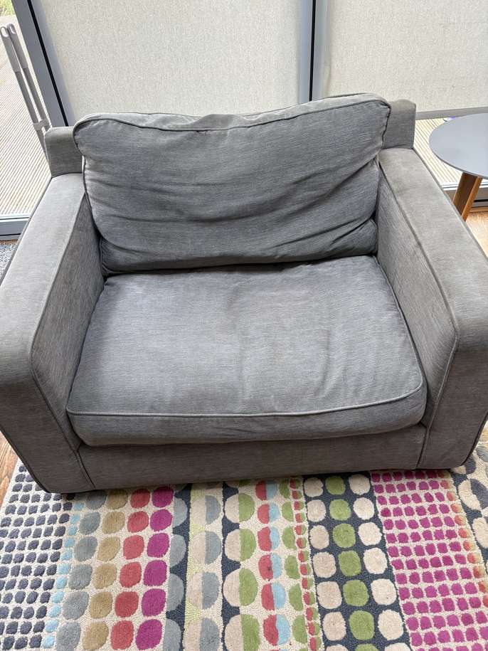 Large grey square loveseat in chenille from DFS. Fabric not torn but could do with a clean - comes up nice when done!