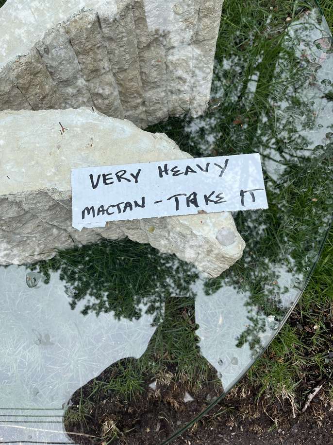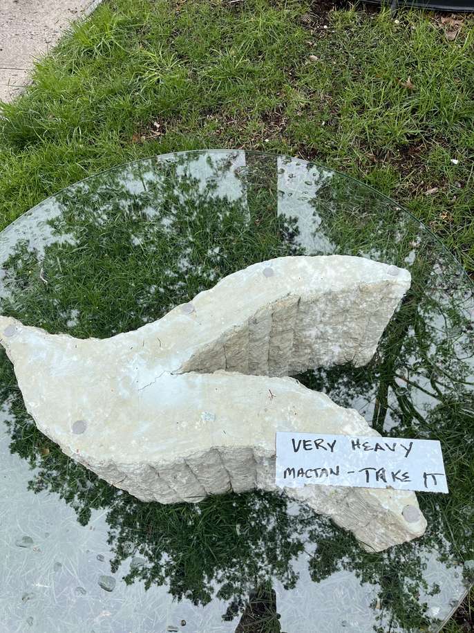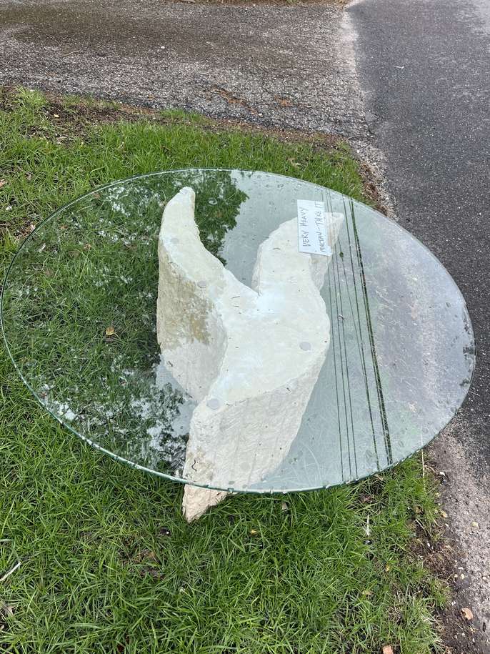 Tessellated Mactan Stone Coffee Table with glass top. This is a unique table and needs minor repair which could be done with a teaspoon full of compound. They do sell for good $$$ on ebay, but its heavy, so Im not getting into that. Sitting at the end of the driveway, come and get it.