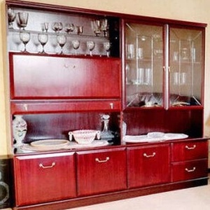 Large mahogany unit - top part separates from the bottom cupboards. All in polished mahogany and in excellent condition. Drop down mirror backed drinks cabinet with drawer unit and shelves in top part. Needs two people and large vehicle to remove and take away