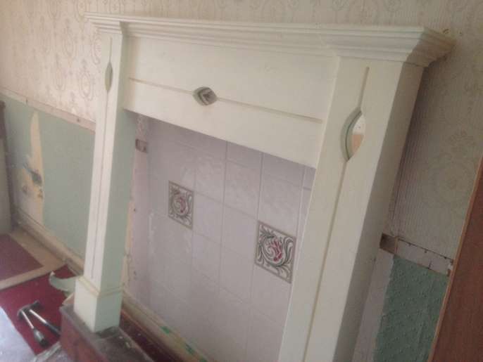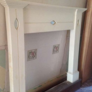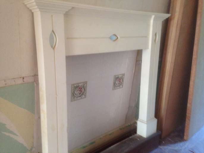 Small mantel-piece in wood, decorative item, painted white, with art-nouveau type detail and inset mirrors. The top is 127cm wide, and it is 120cm high. The tiles pictured are not included.