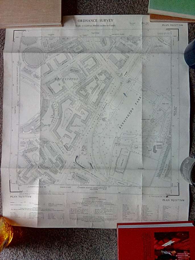 2 large laminated A-Z maps of London. Premier map 1992 London size 92cm X 117cm. Post code map of London and surrounding area 91.5cm x117cm. 1 small laminated ordnance survey map of Wimbledon and Dulwich 47.5cm x 100.5cm. 3 paper ordnance survey maps . 1965 street map of Lewisham, Bromley and Sydenham east 58.5cm X 87.5cm. Kennington London 49cm X 56 cm. Map in 2 parts spanning Norwood, Camberwell and Dulwich 63cm x 42/46.5cm.
