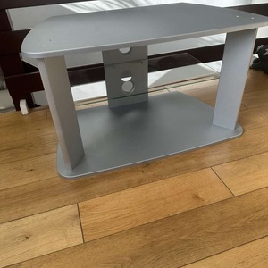 Excellent condition, no scratches. The unit will fit in a corner or against a flat wall. Can be used for a TV or an audio system . Silver colour with clear glass shelf below. Measures 80cm wide curving to 60cm across the back x 50cm deep.