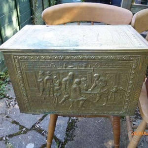 Chest 54 x 31 x 32 cms high. Top, front and sides covered in decorative metal. Metal on top damaged.