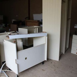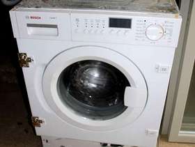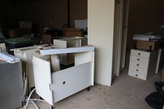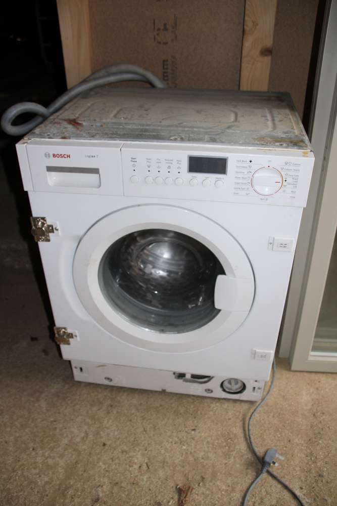 A number of off-white kitchen units, comprising two drawer units, two double door units, also a large built-in fridge unit (fridge no good) coupled with a larder cupboard. Small amount of worktop with hole for sink unit. Built-in Bosch washing machine and also dishwasher (not shown). Take anything you want, as any items left over will go on the bonfire!