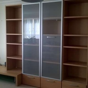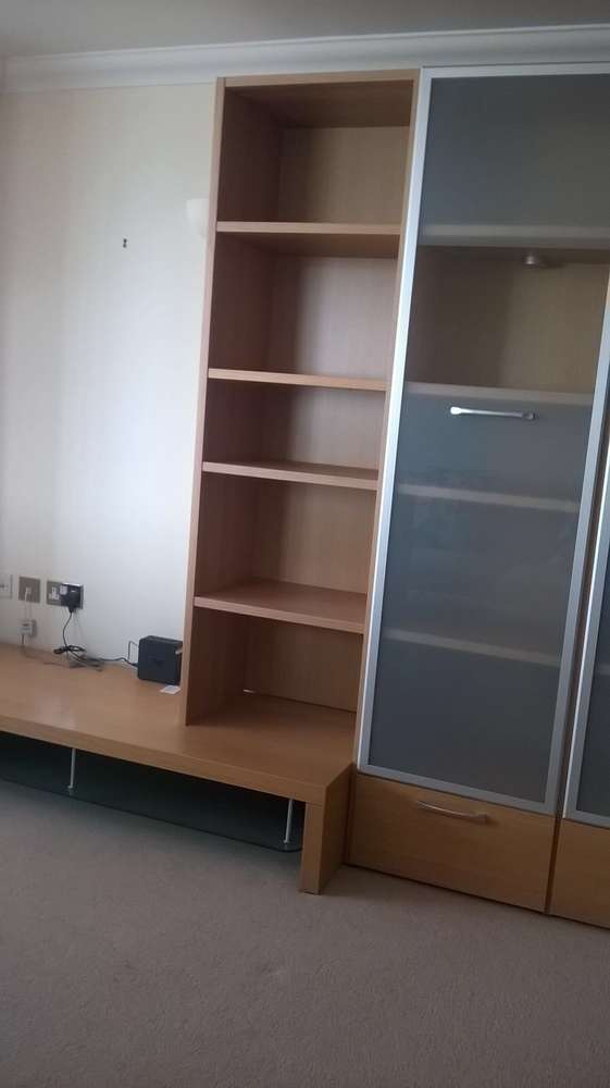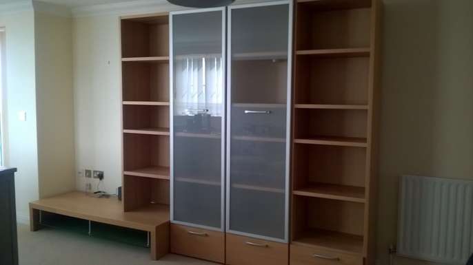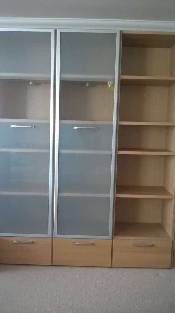 Wall TV/display cabinet basically new. Lights in each of the 'glass' display cabinets. Very good quality about 3m wide. Requires dismantling, as much as you feel is needed for transport, and taking away by you please from Southbourne