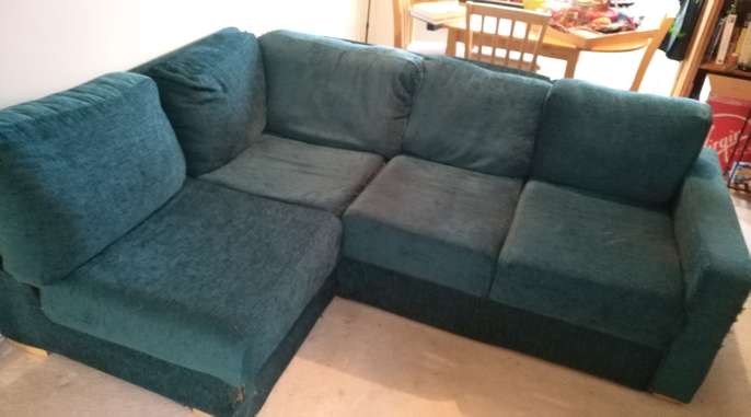 Corner sofa/chaise in Teal. This sofa is 5 years old and is showing some wear (shown in pics), but the cushions are still comfortable as is the seating area. If the visible damage is putting you off, this sofa is actually a "build it yourself" design from https://www.nabru.co.uk/self-assembly so you can actually replace specific parts as needed, for any of it. Unfortunately I no longer have the instructions on how to put it together, but have taken many pictures whilst it was being dismantled. The Sofa is 224cm wide and 170cm long (along the chaise part)