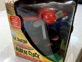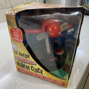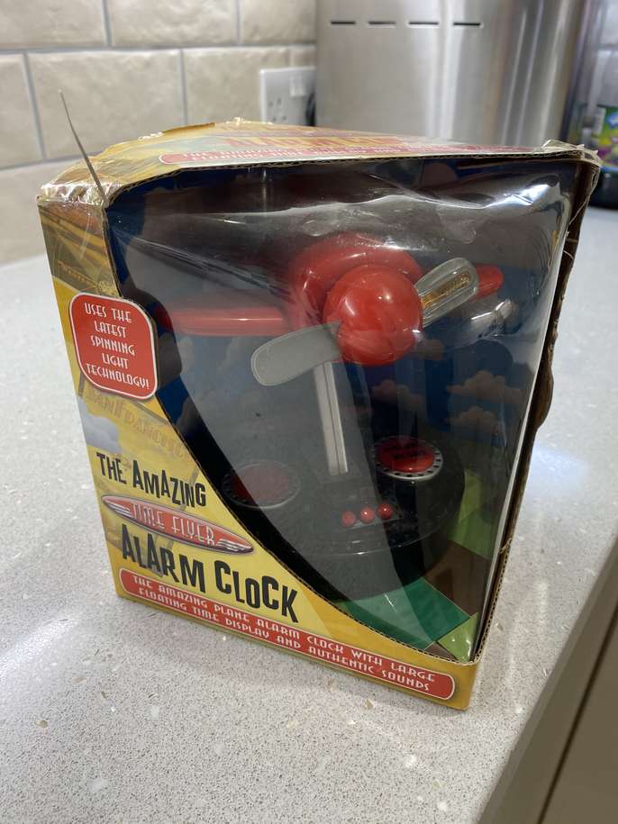 An aeroplane That projects the time and makes authentic sounds. Battery powered. A gift that has been in a cupboard , package damaged but never been opened.