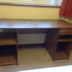 Oak stained desk 1400cm x 580cm with shelves and drawer. Takes apart. Taker to dismantle and collect.