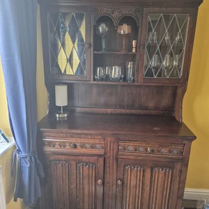Solid oak unit, top part detaches for easier transportation, H178cm x W115cm x D45cm on the base. Has couple of water marks. Collection from Aughton