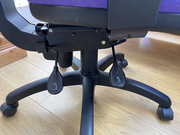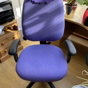 Adjustable office chair - height/angle (see photo), on wheels for easy movement, adjustable arms, Purple upholstery but would benefit from stitching at top (see photo), black back. No longer required. (Hampton Wick)