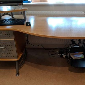 Substantial Office Desk - to be collected by Monday 7th May. Includes Drawers, Computer shelf and Monitor Stand. Desk top unscrews from drawers and legs for transport. Dimensions: 1600 W, 900 D, 730 H.