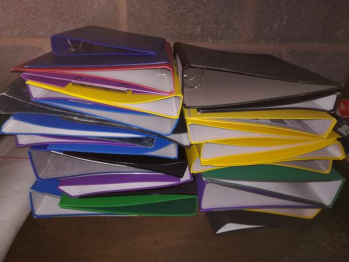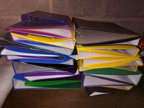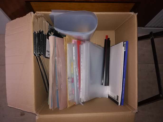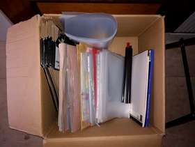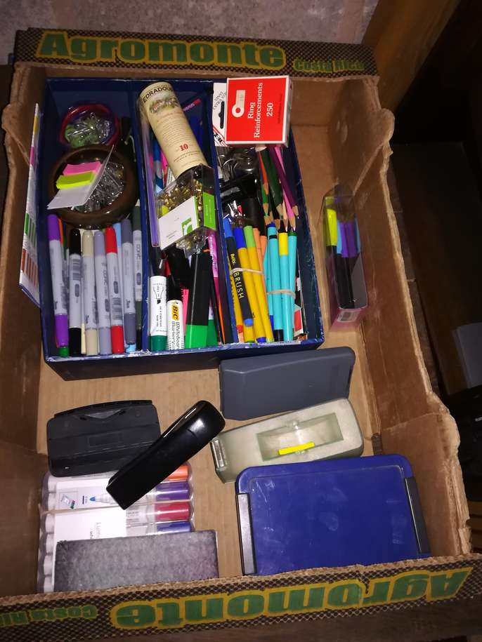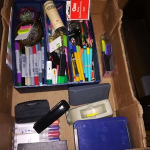 3 boxes of office stationery, some used some new. Includes wide selection of pens, markers, etc stapler, hole punch, calculator Separate box of used lever arch and ring binders. Separate box of files, folder, plastic inserts, binders and used magazine boxes. Also three flip charts.