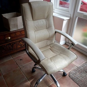 Faux leather high back swivel chair. Shows some signs of wear on the arms