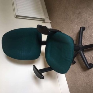 Adjustable office/computer chair, blue material covered with black arm rests (height and arm rests adjustable). Available to collect most days and evenings. Minor damage to one of the arms.