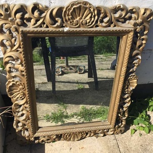 An ornate mirror in a gold painted frame (some damage). Heavy, and roughly 50 x 80 cm).