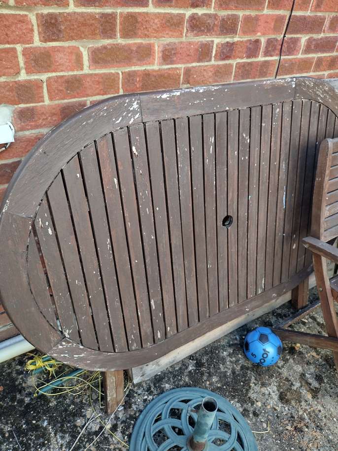 Outside table & 6 x chairs This item is in West Byfleet GB All the details Wood table & 6 matching chairs. Very worn. Could be good for up - cycling Category Home & Garden The Request Period For This Item Has Ended The request period for this item has ended Post Message