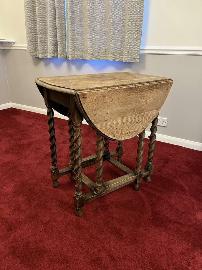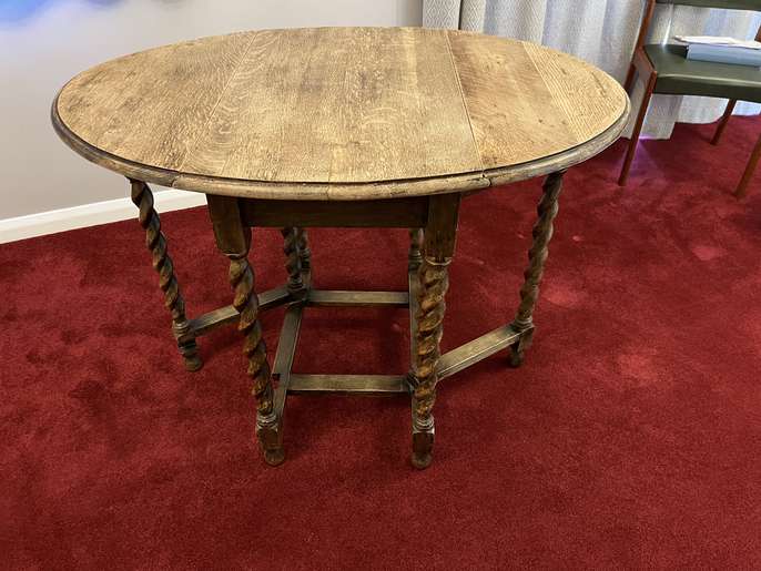 Solid oak Oval table with barley twist legs - in sound and good condition. 2ft 6in x 3ft x 5in Requires restoration befitting the era it was made. Had it many years now looking for a new home