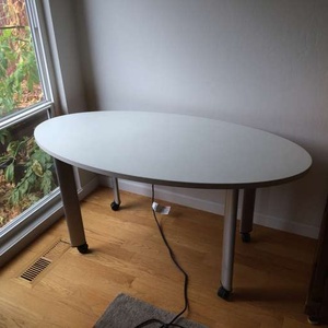 Light colored table, oval shaped. It is about 2.5 x 4.5 feet at the edges. It has rolling feet. Pick-up in Mountain View.