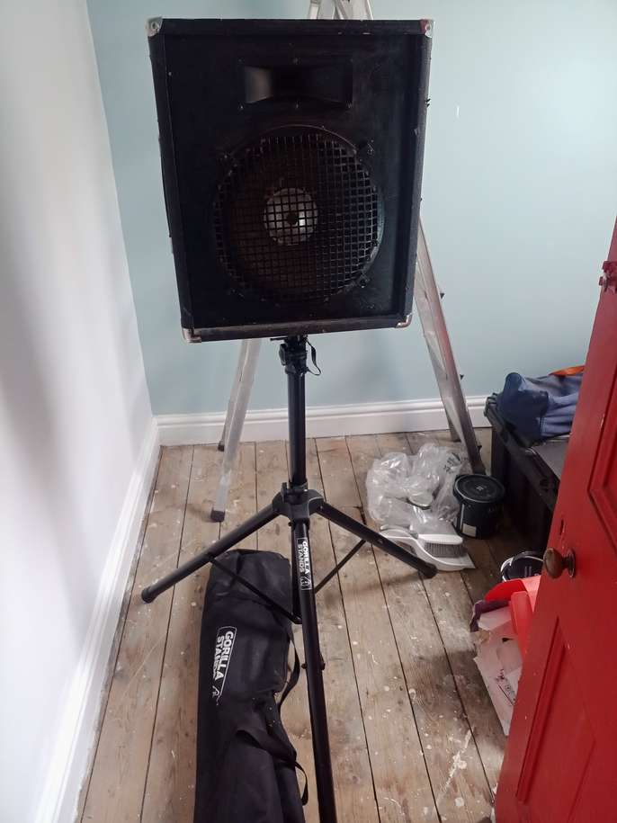 Pair of home made passive pa speakers loaded with 12inch Celestion 100w G12 drivers and generic horns, 1/4 inch Jack connectors. And a pair of gorilla stands with bag. Suit a young band starting off ,an acoustic band playing 50-100 seaters or a practice space pa for full electric band.