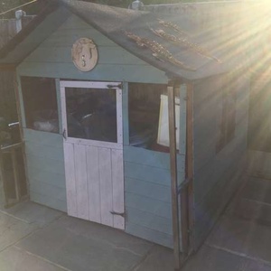 Pretty Painted wooden playhouse well used but still good just missing front step. 5ft 8 deep including front balcony by 5ft 2 wide. Need to dis-assemble and collect ASAP.