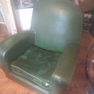 Two green rexine armchairs with velvet cushions, could do with some tlc